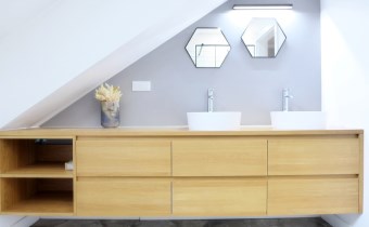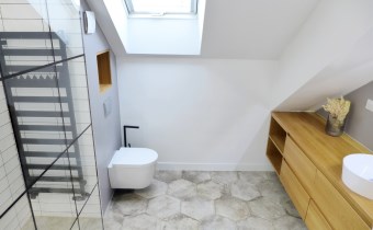 Mieszkanie położone jest na pierwszym piętrze i na poddaszu. Ponad drugim poziomem jest schowek/pomieszczenie magazynowe.