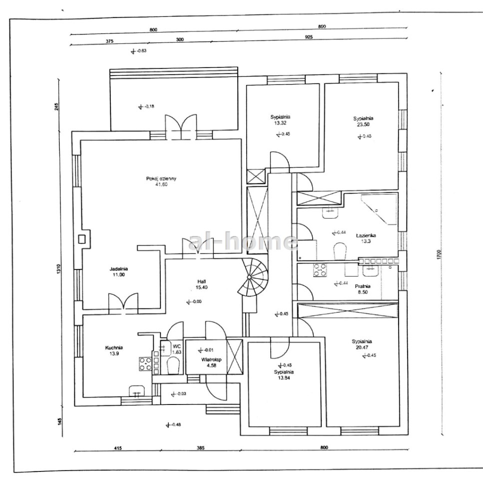 W domu zaplanowano duży salon (42 m2) połączony z jadalnią (11 m2). Widna wyposażona kuchnia (14 m2). Cztery widne, ustawne sypialnie (24;21;14;13 m2), łazienka z wanną i kabiną prysznicową (13m2), wc (1,8 m2), pralnio suszarnia (8,5 m2), hal i wiatrołap (20 m2).