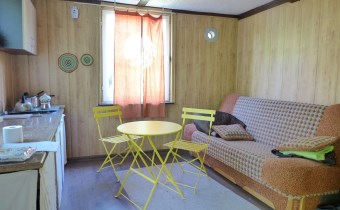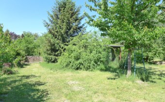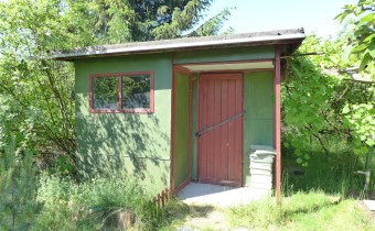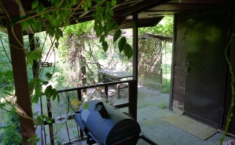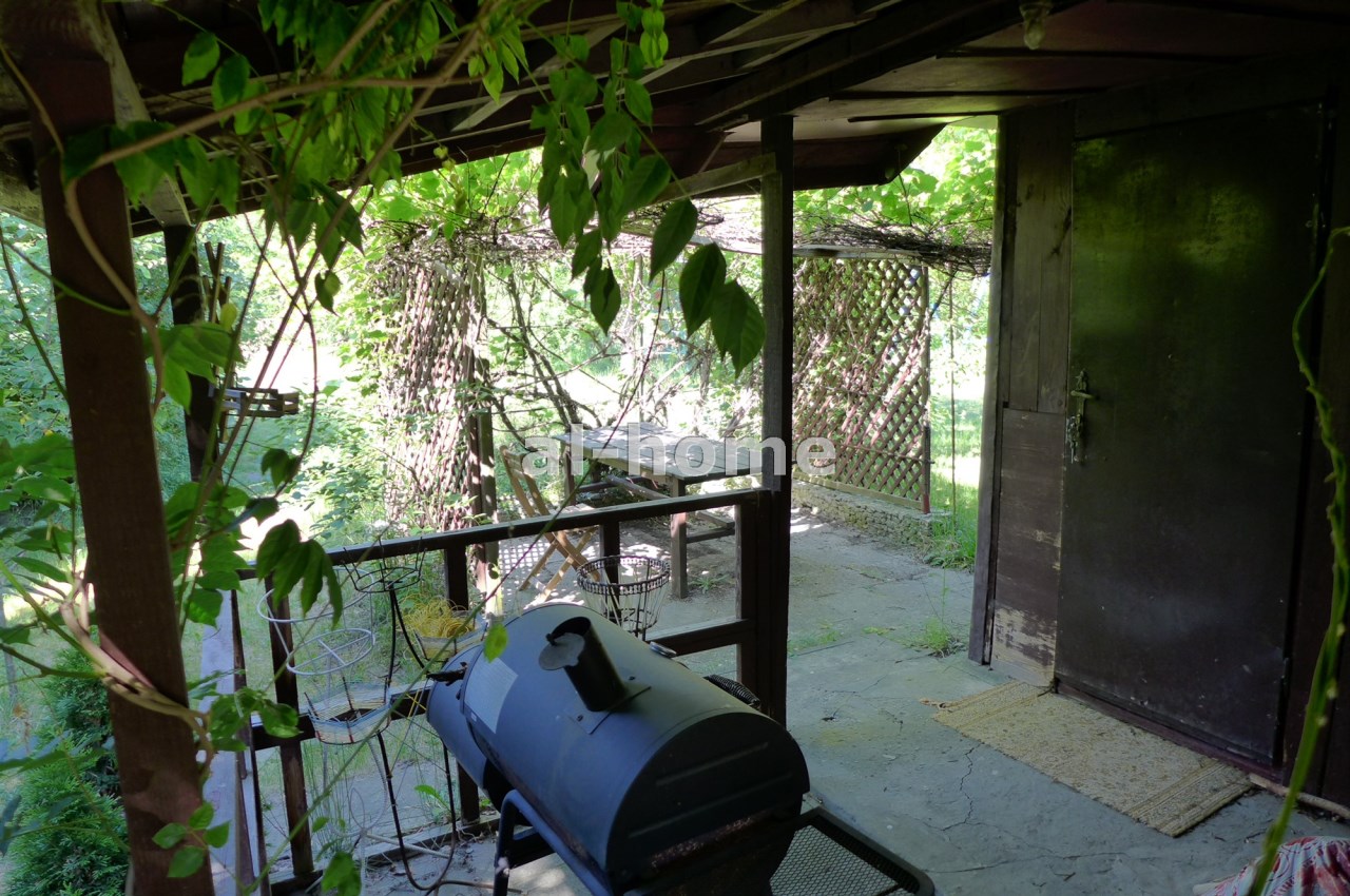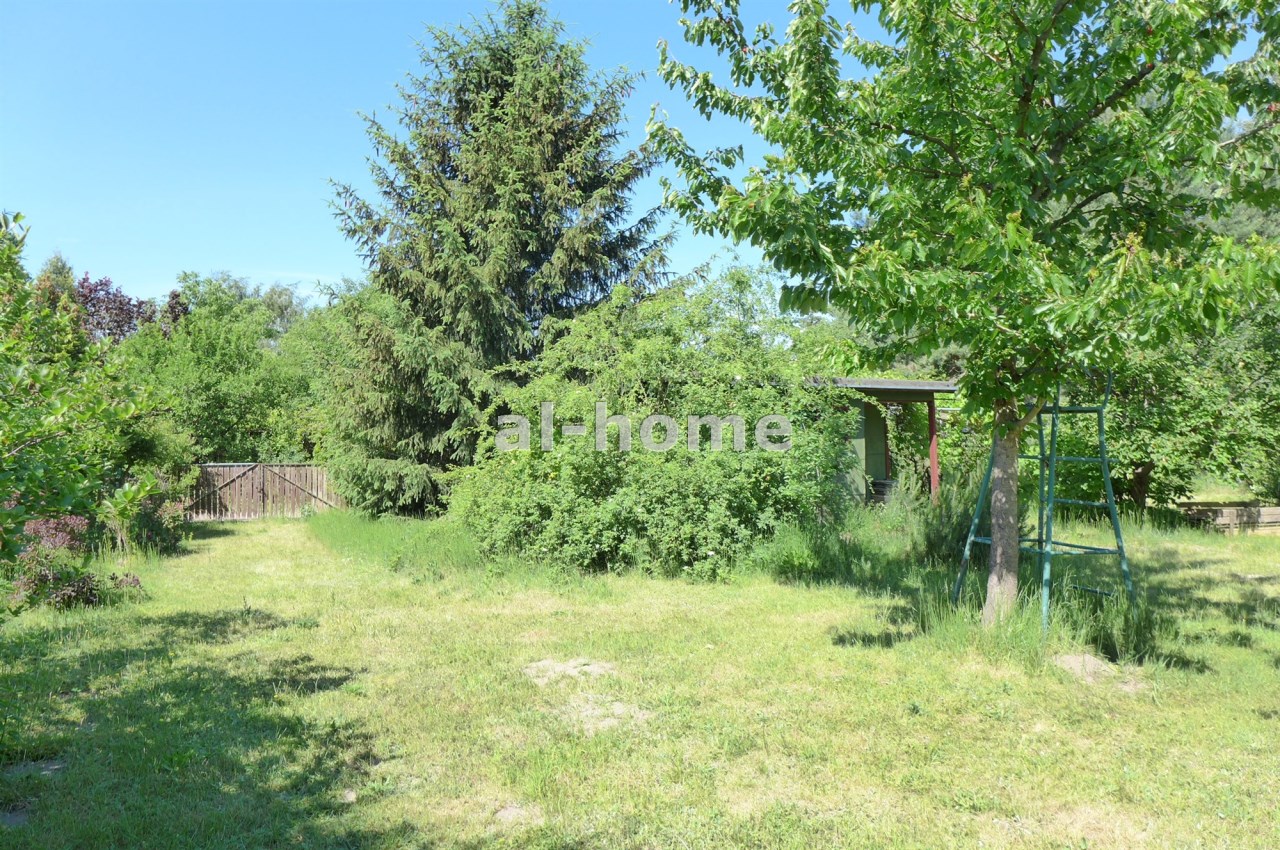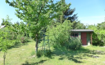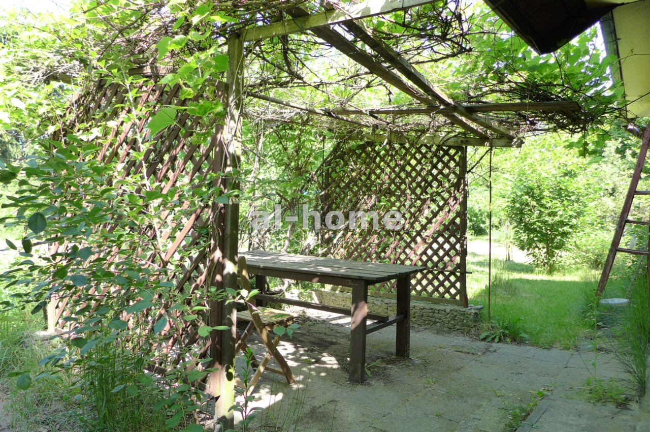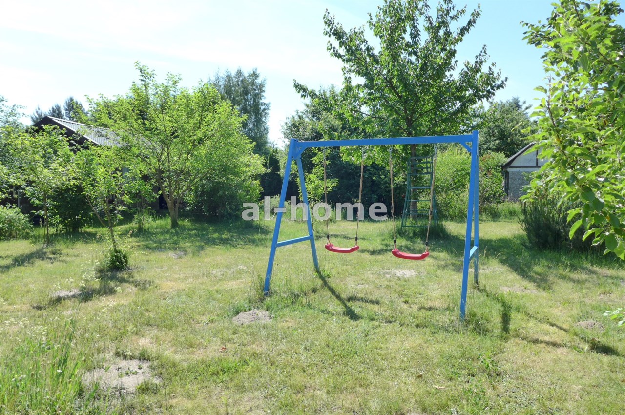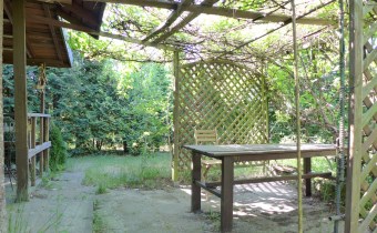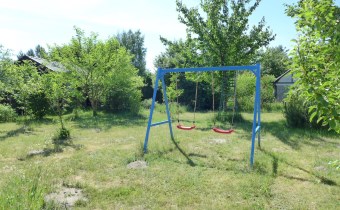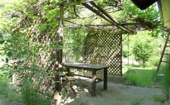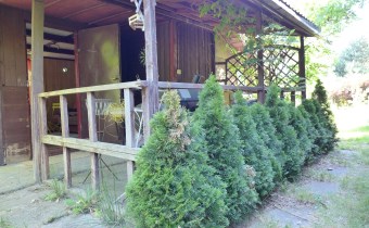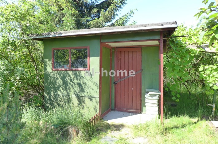 Na działce stoją dwa domki. Jeden mniejszy np. dla dzieci lub jako schowek. Drugi większy z blaszanym dachem, wyposażony w kanapę, kredens, szafki i blat roboczy z kuchenką gazową (gaz z butli). Na jego tyłach jest szopa na narzędzia (solidnie wyposażona wraz z kosiarką). Z domkiem połączona jest zadaszona weranda i pergola, a pod nią stół z krzesłami.