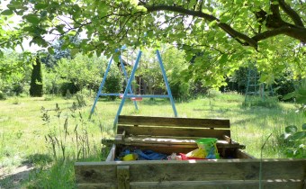 Przestrzeń na basen, do zabawy dla dzieci z solidną wmurowaną nową huśtawką, piaskownica i hamaki. Krzesło tenisowego sędziego, świetna zabawa. Zrywając czereśnie można obserwować dziatwę rozgrywającą mecze.