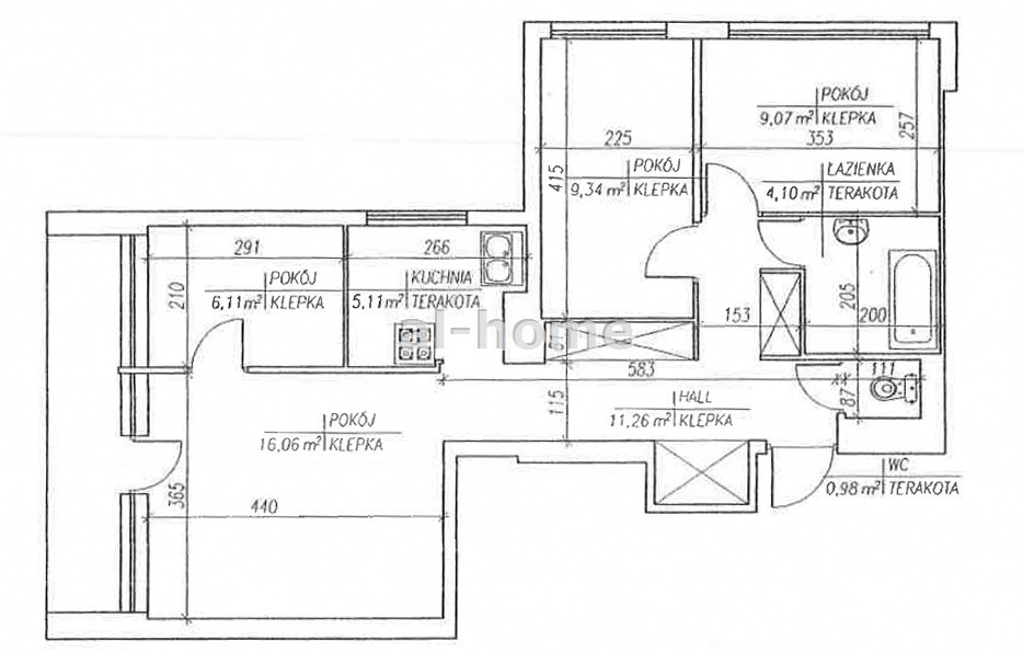 Pokoje 16-9-9-6 m2, kuchnia 5m2, łazienka 4m2,wc 1m2 i przedpokój 11m2, Loggia 9m2. Układ pozwala na dostosowanie do indywidualnych oczekiwań, własną aranżację np powiększenie kuchni o jadalnię. Do mieszkania przynależy piwnica. Bezpłatny parking wokół budynku.
